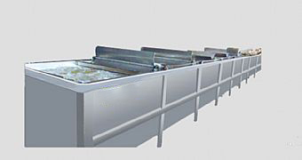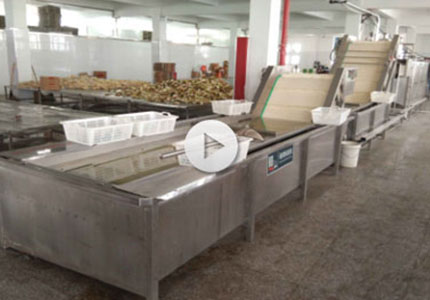 A葉菜類:收菜--分揀輸送--氣泡清洗(粗洗)--氣泡清洗殺菌機(jī)--噴淋清洗(凈洗)--風(fēng)干瀝水--包裝輸送。